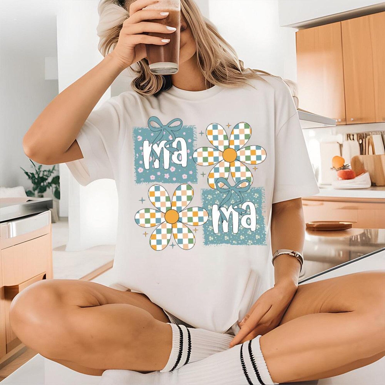 🌸💛 Celebrate motherhood in style with our Mama Checkered Daisy Tee! This playful design features bold retro-inspired daisies in orange, green, and teal checkered patterns, accented with bows and “Mama” lettering for the perfect mix of cute and trendy.